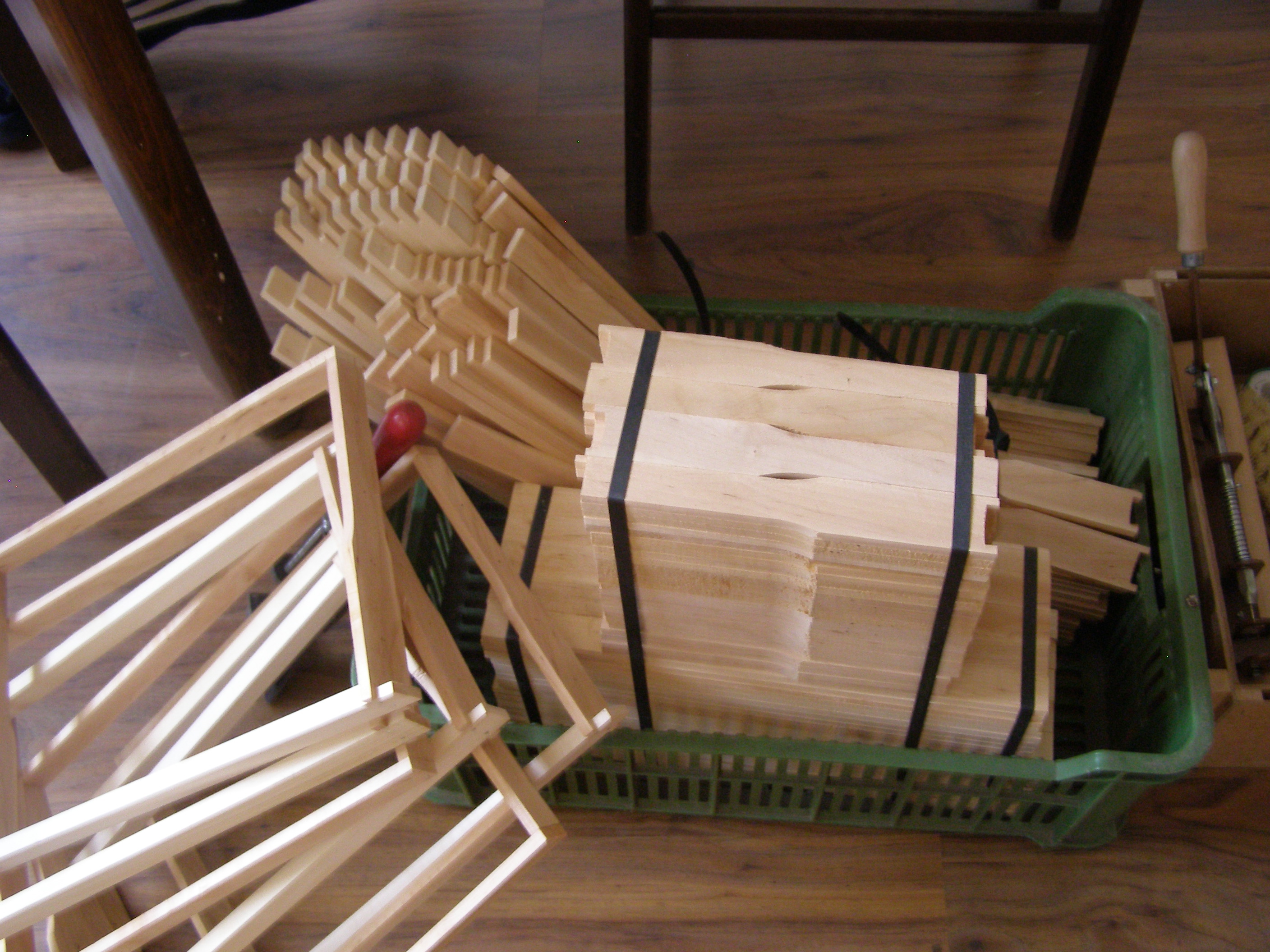 Na obrázcích jsou přpravené přířezy na rámky a včelař stloukající rámeček:-))