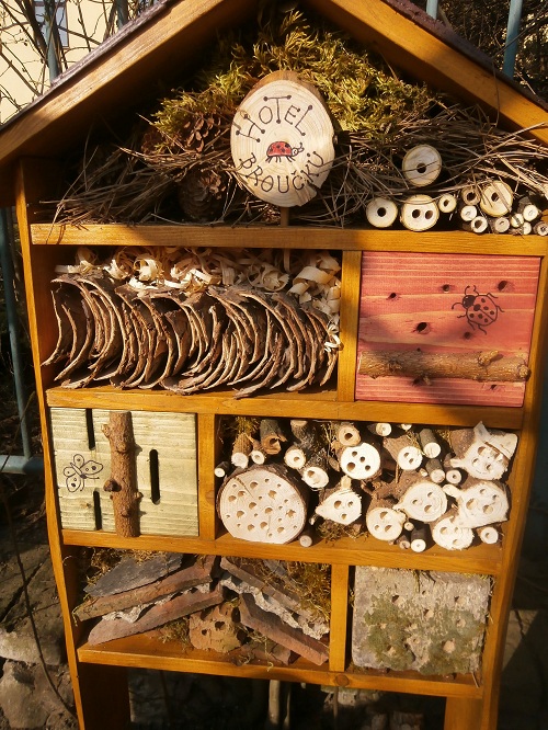 V jedné mateřské škole v Brně mají včelí domeček. Není to úl, ale Hotel broučků, domeček pro samotářské včely, čmeláky a další hmyz. Dokonce se tam již nějaké včely zednice usídlily. Domeček vyrobil pan Šimáček.